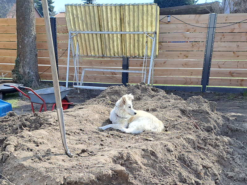 Ich habe jetzt ein Haus mit großem Garten und 4 Menschen, die gern mit mir toben. Hier ist zwar noch etwas Baustelle und es wird gerade viel gegraben, aber da helfe ich auch immer mal mit - dann geht es sicher schneller.