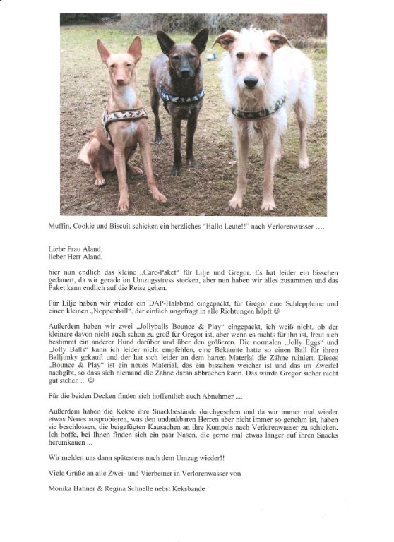 Die Frauchen der Keksbande haben uns schon öfter unterstützt. Und dieser Tage kam wieder ein schweres Paket mit einem sehr netten Schreiben. Wir haben es eingescannt und hier eingestellt bei "weiterlesen" (bitte anklicken - und falls nötig vergrößern mit dem gleichzeitigen Drücken von Steuerung und Pluszeichen, also: Strg +).