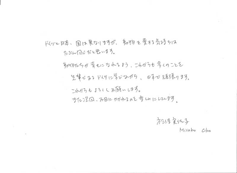 Unsere Gäste hinterließen uns auch Grüße auf japanisch. Sie waren beim Schreiben der komplizierten Schriftzeichen so schnell, wie wir auf deutsch mit einem Computer. Die Übersetzung lautet in etwa: In Deutschland und Japan ist das Land verschieden, aber das Gefühl für die Tiere ist gleich. Ich bemühe mich, die Tiere in Japan glücklich zu machen und durch Lernen von Deutschland als Vorbild. Vielen Dank. Ich freue mich auf ein Wiedersehen. Misako Oho