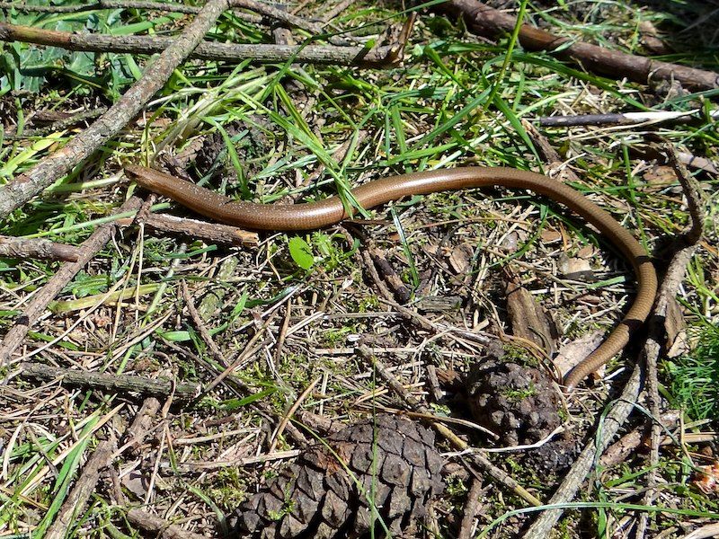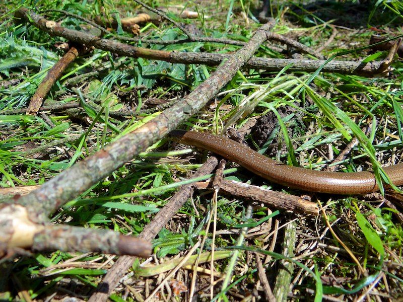Im Gestrüpp sahen wir etliche Blindschleichen. Wir haben ihnen noch eine Reihe neuer Unterschlüpfe zur Verfügung gestellt, damit sie sich weiterhin wohl bei uns fühlen.
