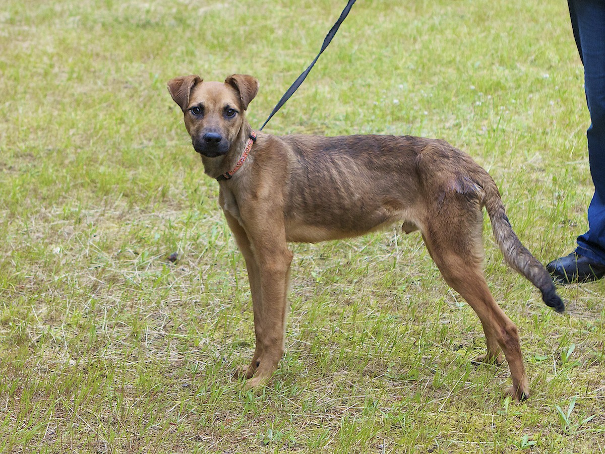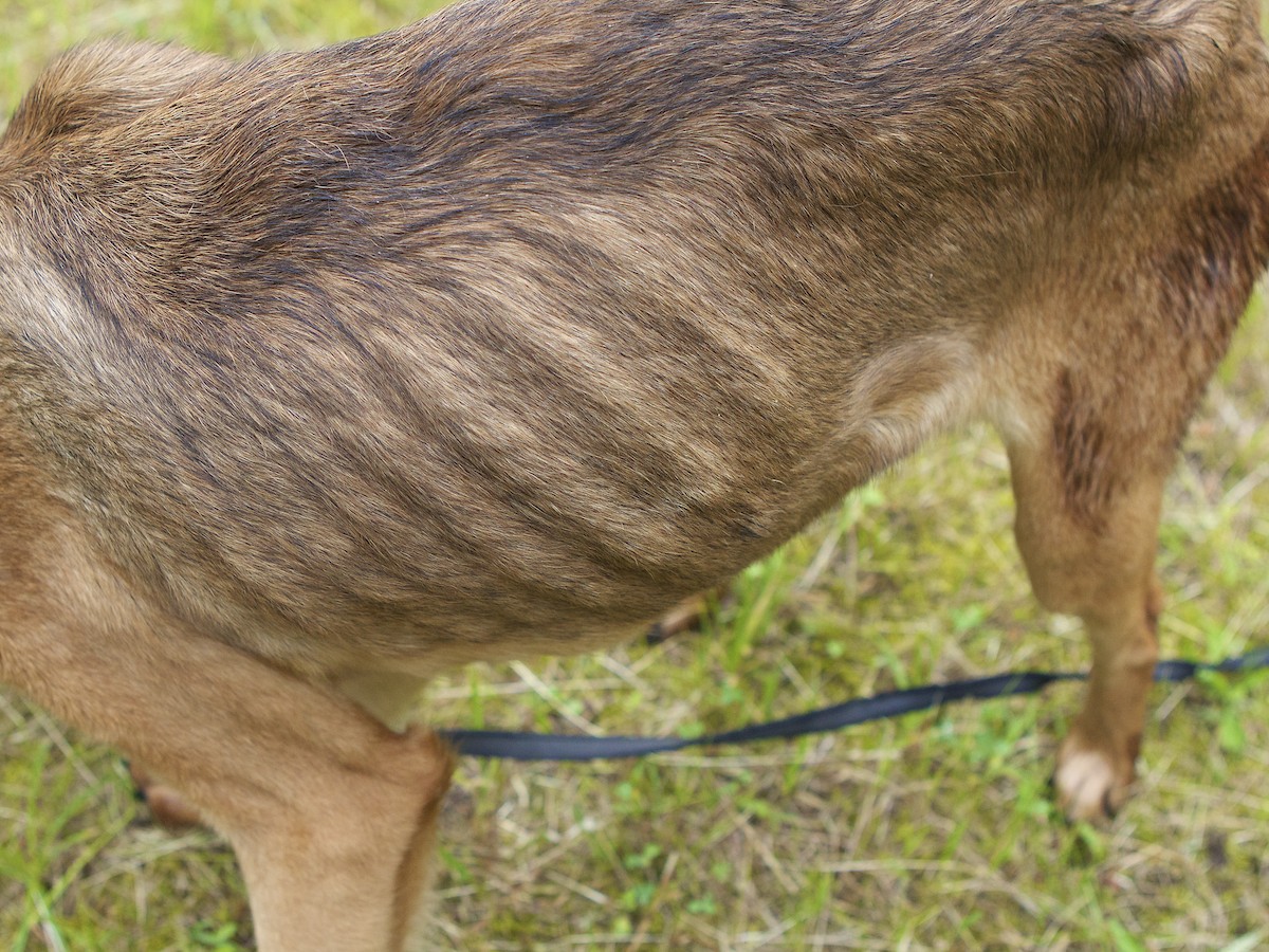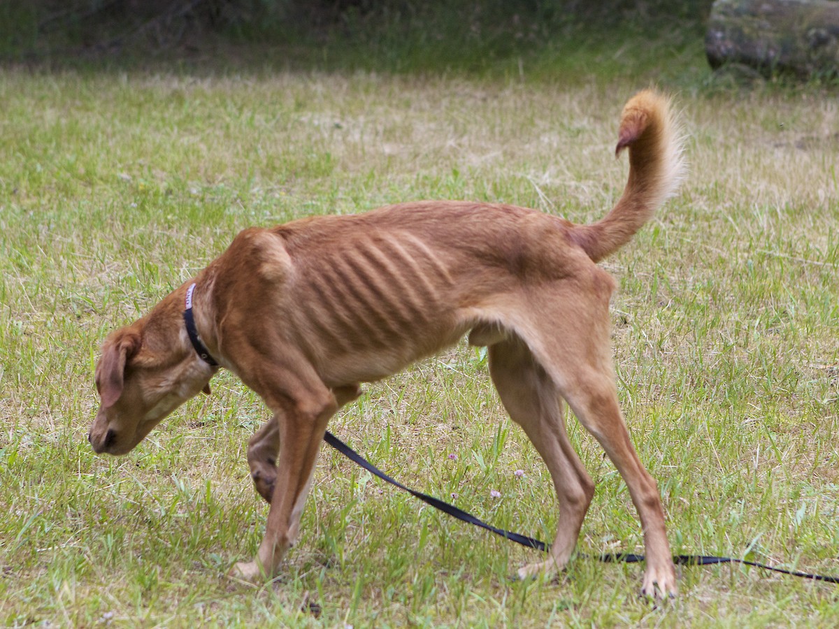 Eine Dame vom Sozialdienst hatte mitbekommen, dass in der Wohnung zwei Hunde zurückgeblieben waren. Sie rief uns an und bat um Abholung der Hunde. Als unsere Mitarbeiterin eintraf, betraten sie gemeinsam die Räume: eine vermüllte und verdreckte Messie-Wohnung, wie man sie sonst nur aus dem Fernsehen kennt, überall Kot und Abfall, bestialischer Gestank und zwei Hunde, die sich ängstlich an den Schrank pressten. Erst beim Näherkommen stellten die beiden Frauen fest, dass die Hunde sich gar nicht anders bewegen konnten, denn sie waren an einer nur wenige Zentimeter langen Kette am Schrank angekettet. Beide Hunde bestanden nur noch aus Haut und Knochen.
