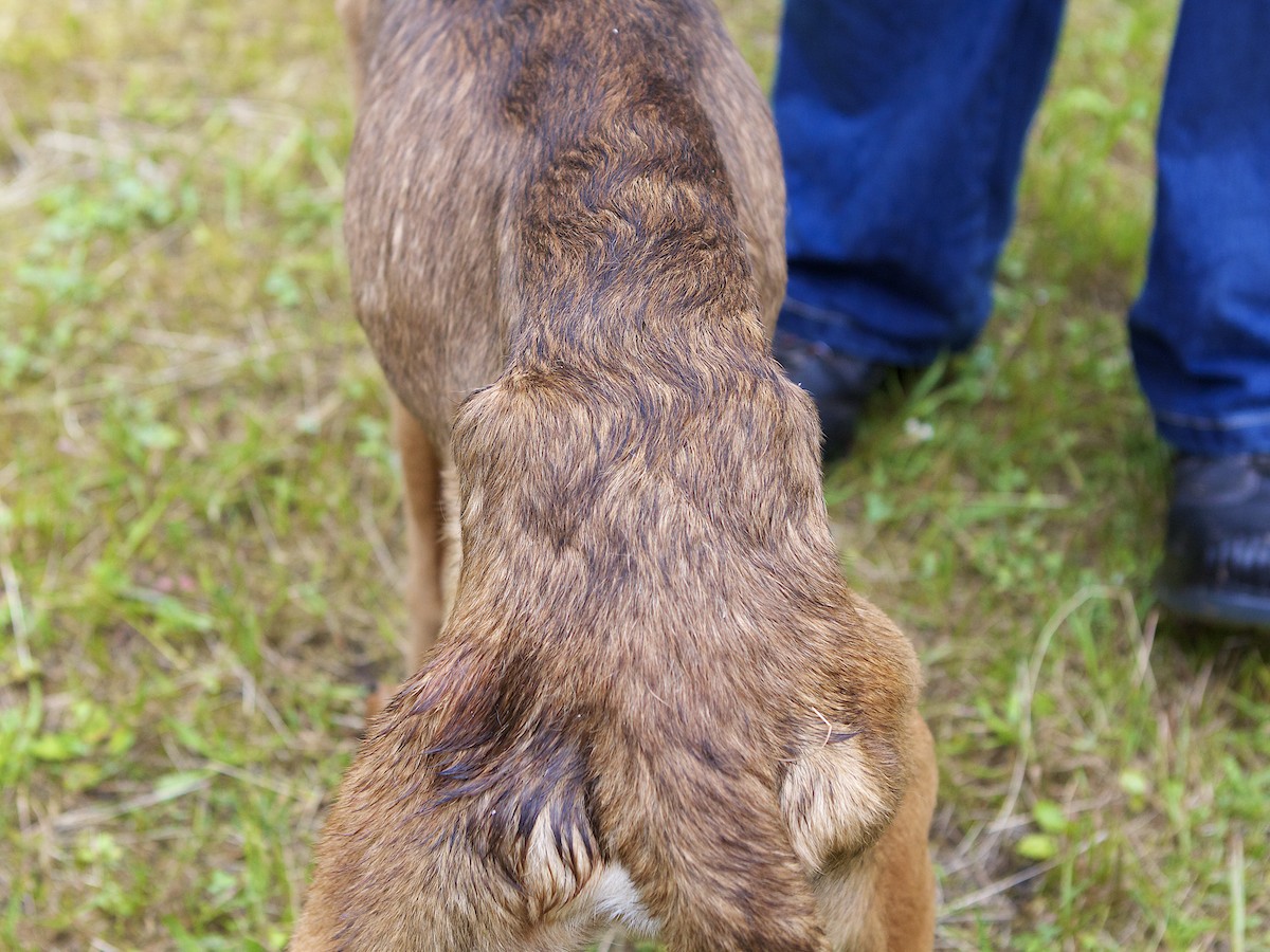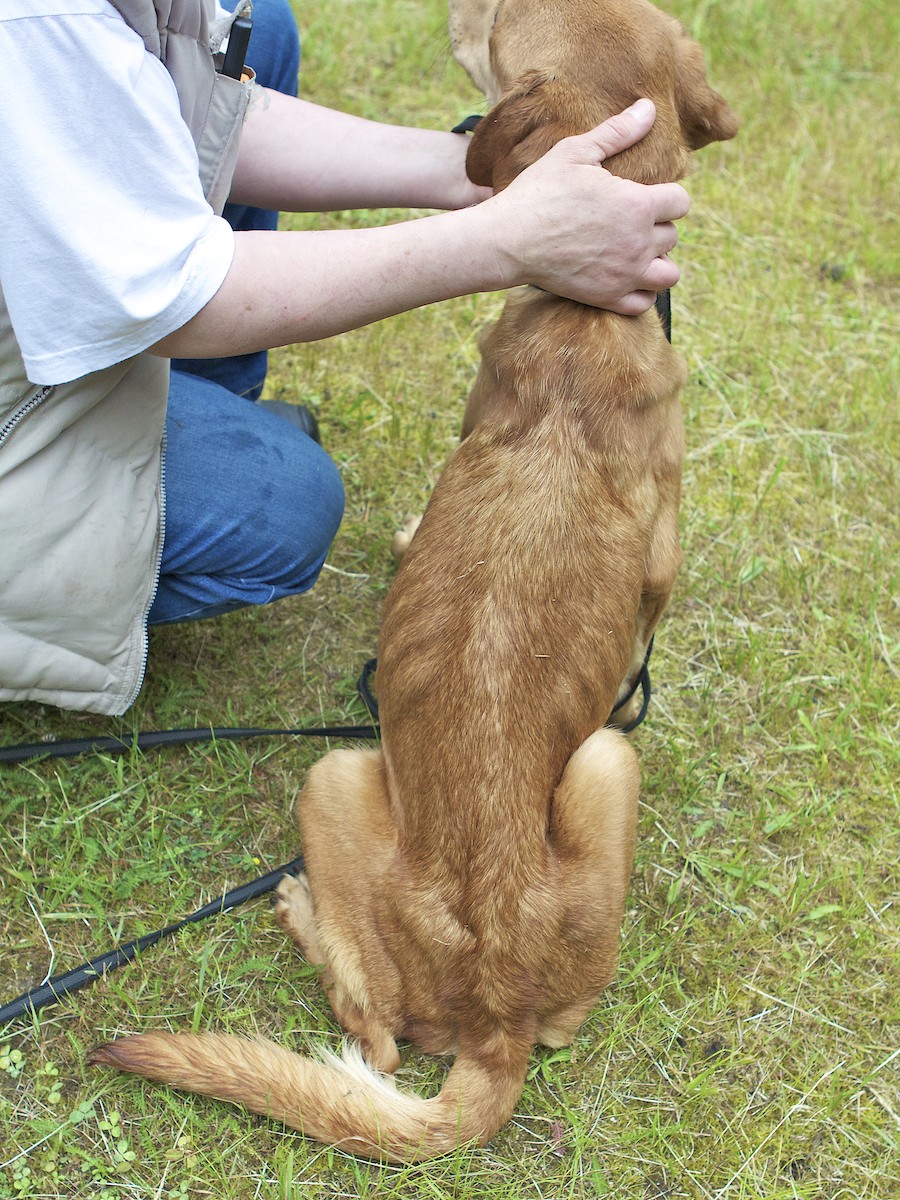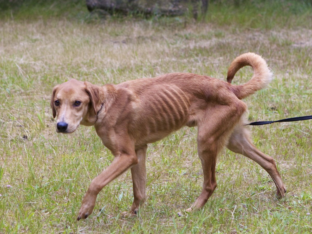 Eine Dame vom Sozialdienst hatte mitbekommen, dass in der Wohnung zwei Hunde zurückgeblieben waren. Sie rief uns an und bat um Abholung der Hunde. Als unsere Mitarbeiterin eintraf, betraten sie gemeinsam die Räume: eine vermüllte und verdreckte Messie-Wohnung, wie man sie sonst nur aus dem Fernsehen kennt, überall Kot und Abfall, bestialischer Gestank und zwei Hunde, die sich ängstlich an den Schrank pressten. Erst beim Näherkommen stellten die beiden Frauen fest, dass die Hunde sich gar nicht anders bewegen konnten, denn sie waren an einer nur wenige Zentimeter langen Kette am Schrank angekettet. Beide Hunde bestanden nur noch aus Haut und Knochen.