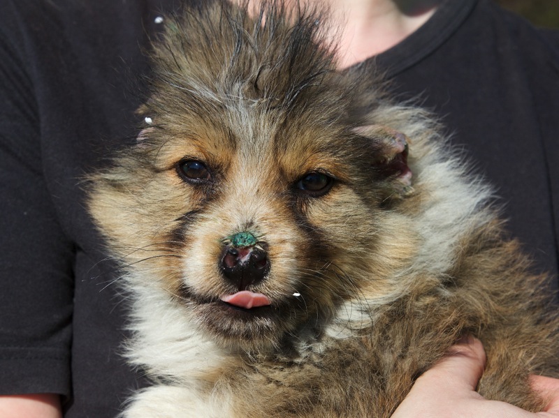 Ein Welpe, ja wie soll ich es beschreiben: Beide Ohren sahen wie abgeschnitten aus und sie hatte in der Nase ein Loch. Sie duckte sich, wenn man mit der Hand von oben kam. Ein Welpe von ca. 3-4 Monaten. Den verletzten Schwanz, der noch amputiert werden sollte, hatte ich noch gar nicht gesehen. Was hatte man diesem unschuldigen Baby angetan?