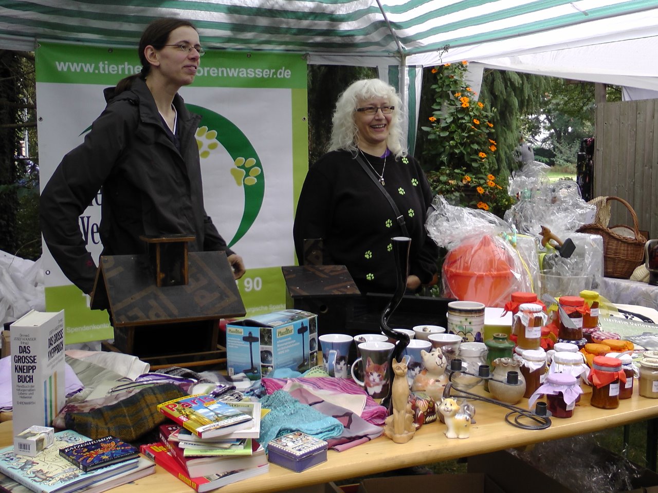 Ehrenamtlerin Annette (rechts im Bild) hatte selbstgemachte Marmelade mitgebracht. Auch Trödel, der bei uns abgegeben wurde, konnte gleich mit angeboten werden. Gemeinsam mit Tierpflegerin Anja und unserem Tierheimleiter betreute sie unseren Infostand.