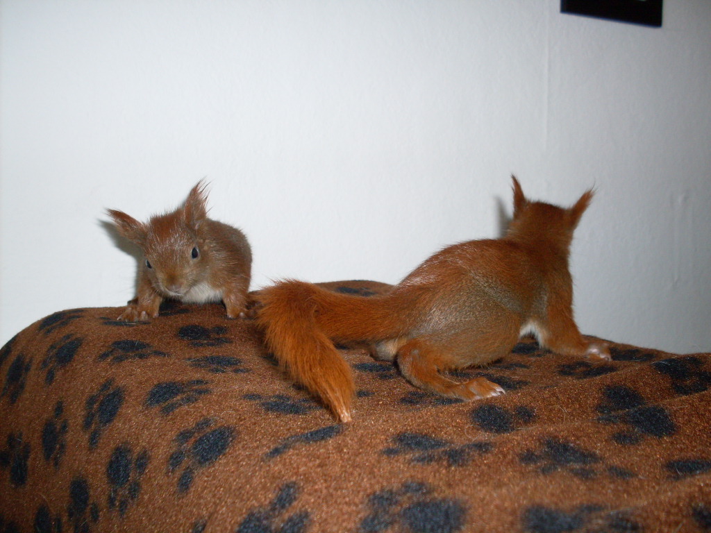 SDC10435Die beiden aus dem Nest gefallenen Eichhörnchen taten sich die ersten Tage sehr schwer. Sie tranken kaum und waren auch nicht an Brei oder feste Nahrung heranzuführen. Egal, was wir versuchten, sie nahmen es nur schwer an. Mit Mühe und Not und tierärztlicher Hilfe konnten wir gerade so das Gewicht aufrechterhalten.