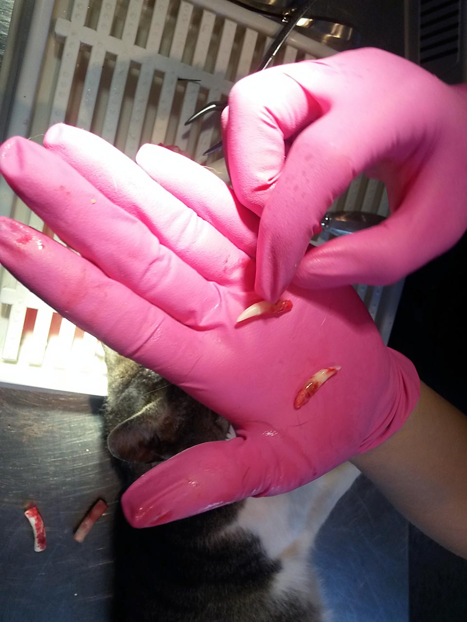 Die Katzen, die nicht kastriert waren, wurden gleich mit operiert. So mussten sie nicht zweimal in Narkose. Bei Tobias laserte Frau Dr. Höfer einen Tumor. Leider stellte sich heraus, dass nicht nur das Zahnfleisch, sondern auch der Knochen betroffen ist. Wir müssen nun schauen, wie der Tumor sich weiter entwickelt.