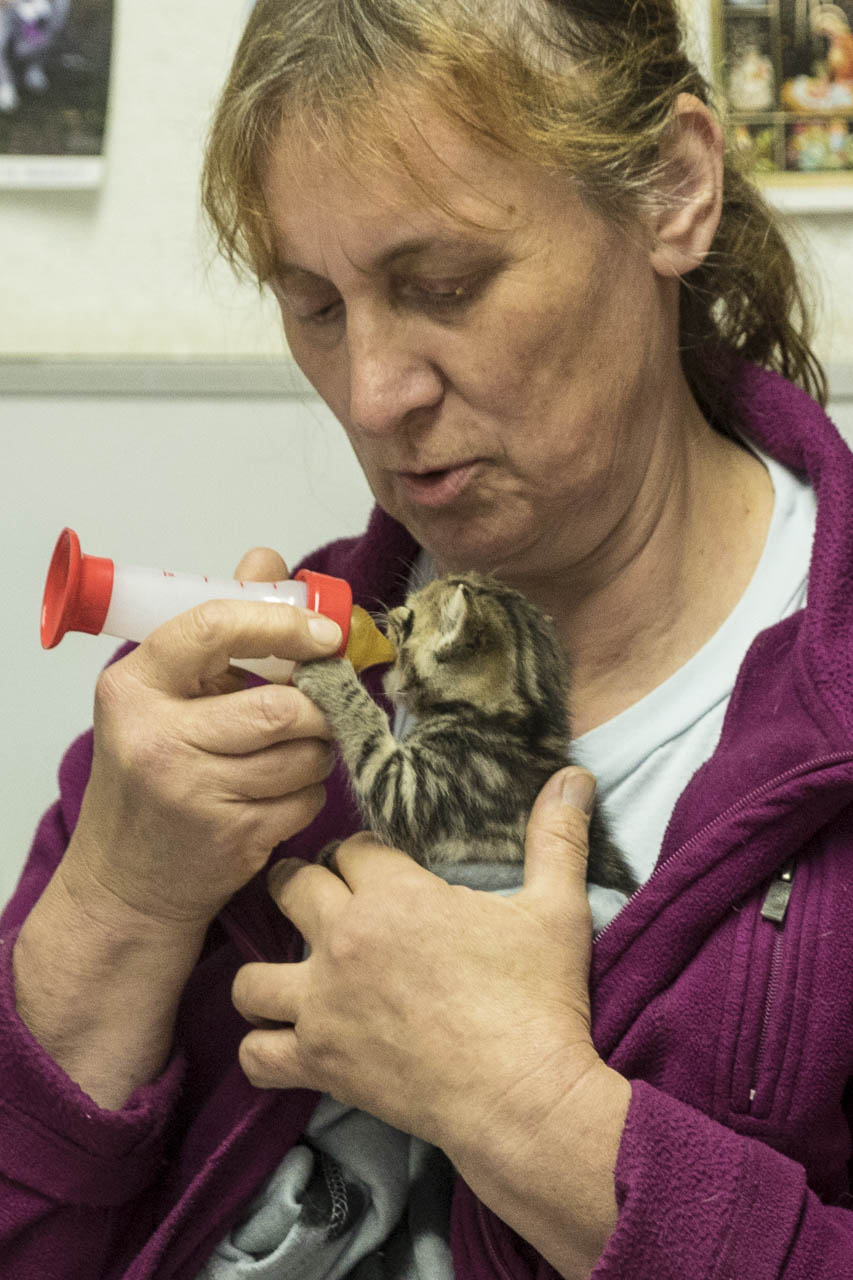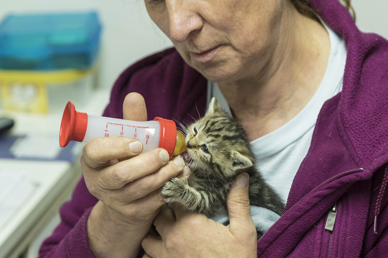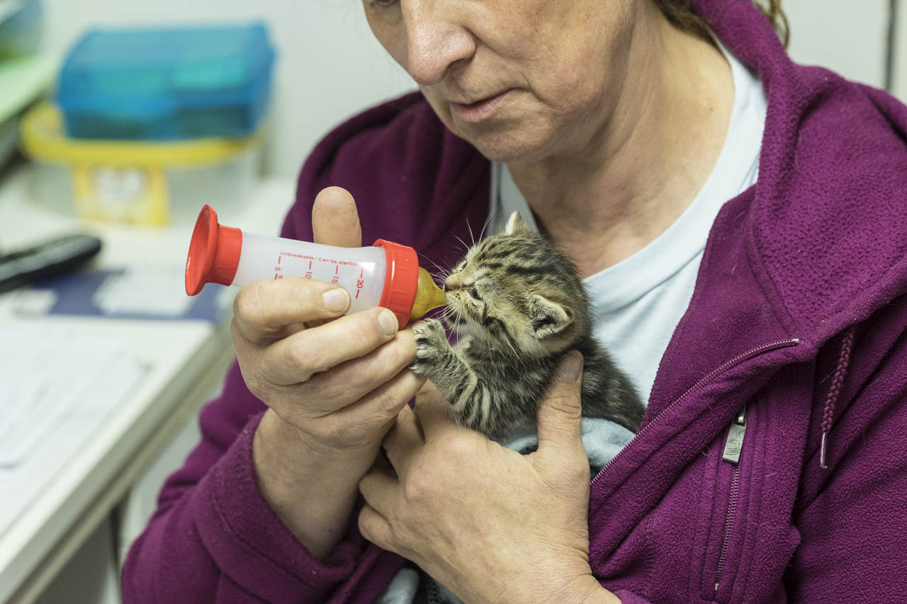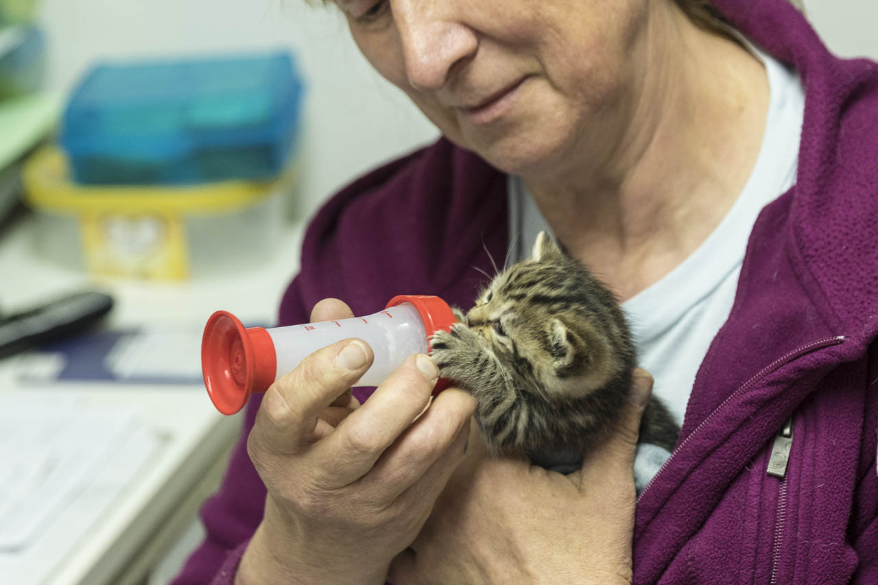 Die Handaufzucht einer so kleinen Katze gelingt nur, wenn Mitarbeiter sie abends mit nach Hause nehmen und sich dann ständig den Wecker stellen.