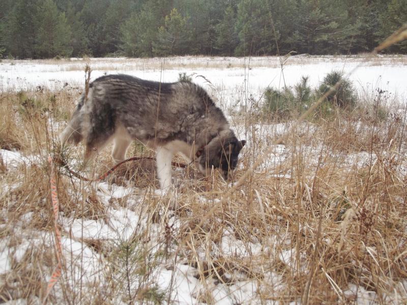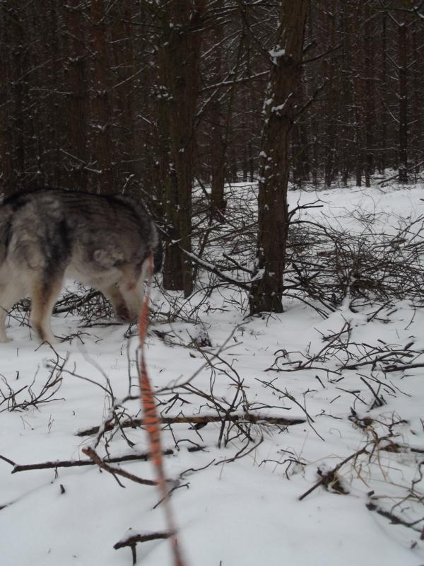 Tierpflegerin Kristin kam an ihrem freien Tag, um mit Yupek eine Extra-Runde durch den Wald zu laufen. Rehe, Hirsche, Wildschweine, Hasen, Füchse, Wölfe ... und wer weiß, was Yupek da noch alles an interessanten Spuren erschnüffelt hat.