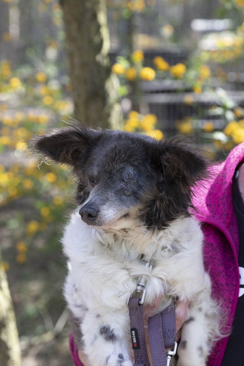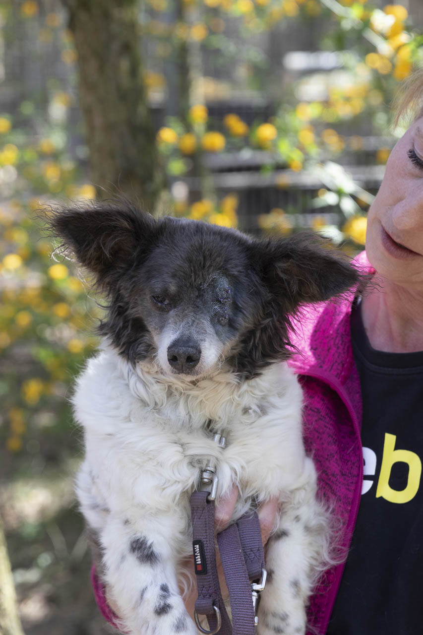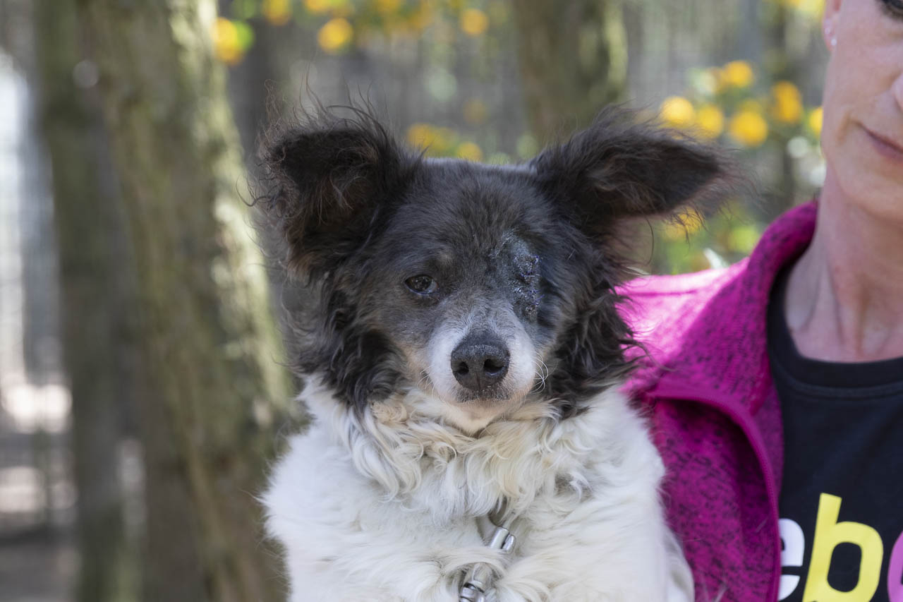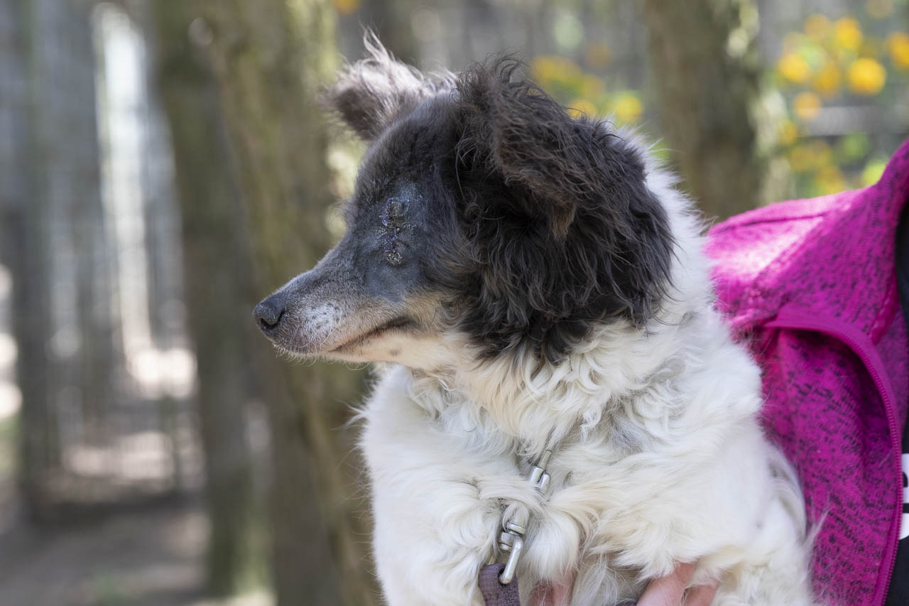 Als wir sie aufnahmen, hatte sie ein kaputtes Auge, das wahrscheinlich auch schmerzte. Unsere Tierärztin war sich zunächst nicht sicher, ob die Augenreste in der Augenhöhle doch noch soviel hergaben, dass man etwas für das Sehvermögen hätte tun können.