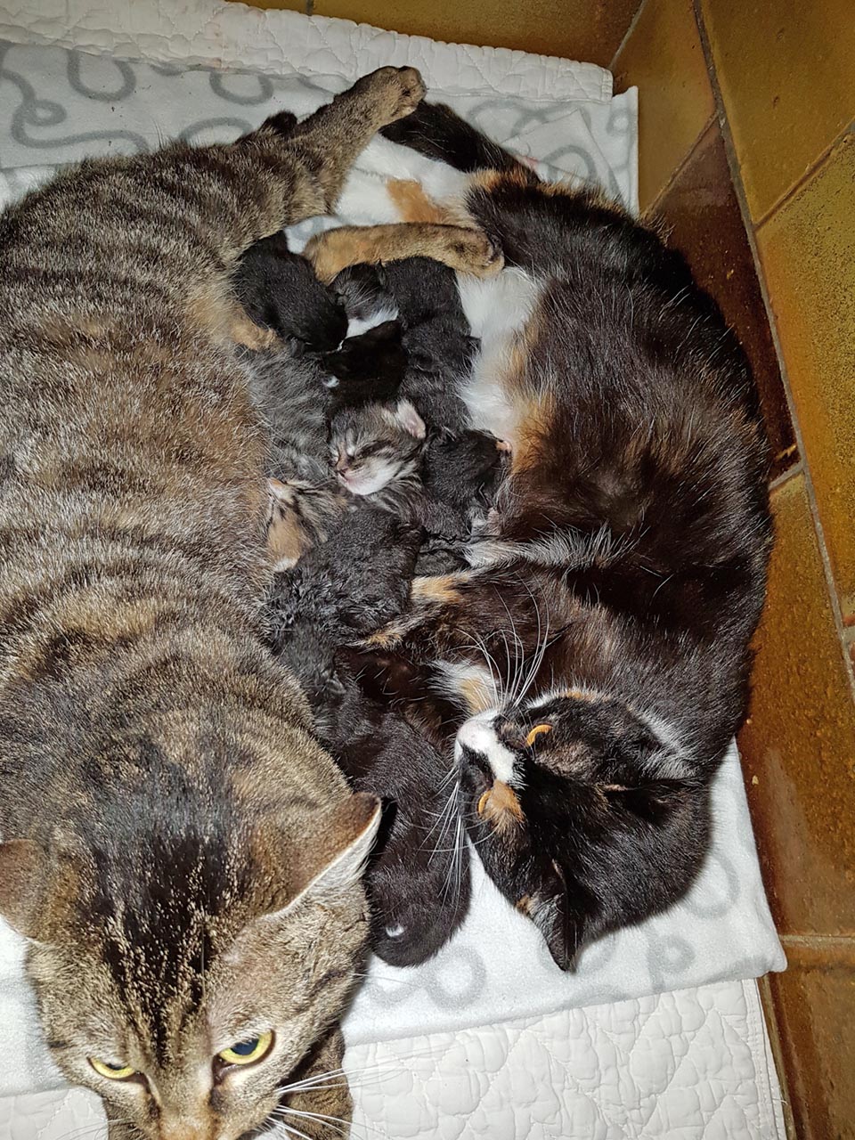 Obwohl wir sie auf getrennten Plätzen untergebracht hatten, sind sie von allein immer wieder zusammengezogen. Die dreifarbige Mama half ihrer Grautigertochter intensiv bei der Pflege der Jungen, während sie auf die Geburt ihrer eigenen Kinder wartete. Seitdem diese nun auch da sind, kümmern sich beide Mütter gemeinsam um alle Neugeborenen, wie man sieht.