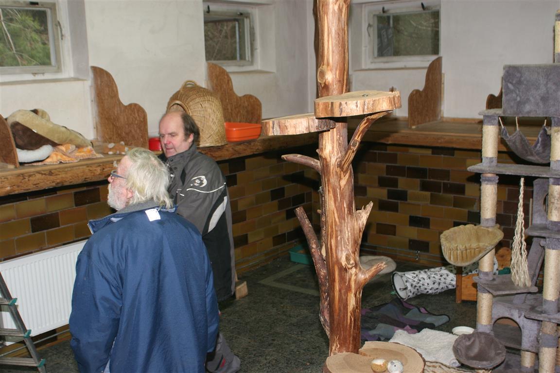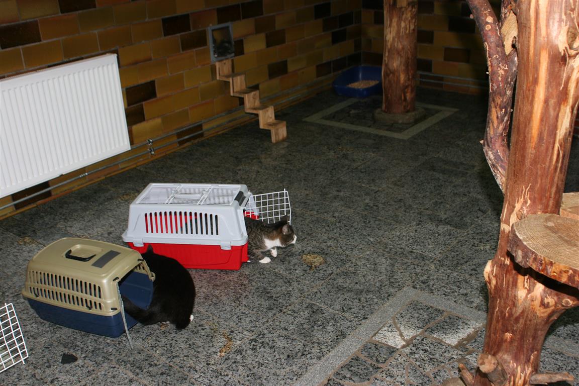 Im Anschluss bestückten wir alles neu: Körbchen, Decken, Kratzbäume, Toiletten, Futterschalen ...