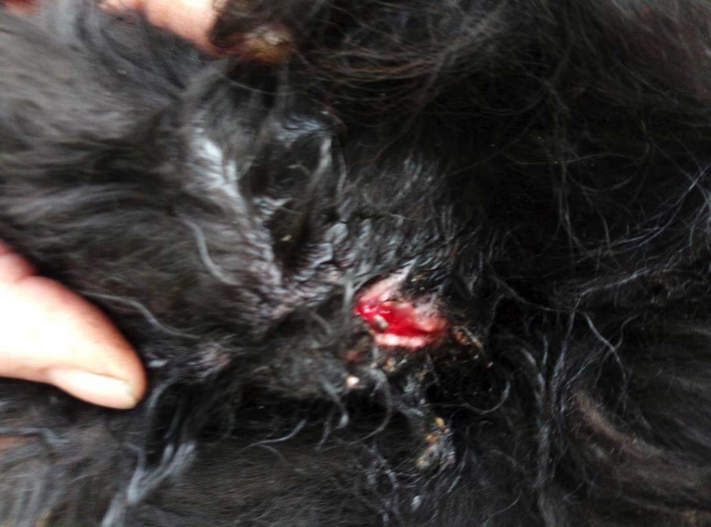 Eine unversorgte Wunde, die unter dem Schorf hervorkam, Würgehalsbänder, und dicke verhärtete Fellplatten machten deutlich, dass es Zeit für die Trennung wurde.