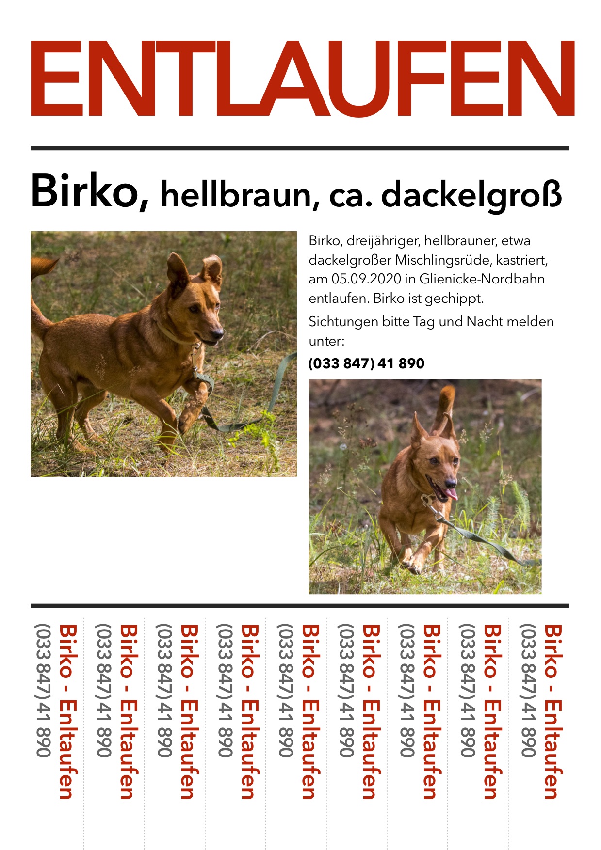 Birko, dreijähriger, hellbrauner, etwa dackelgroßer Mischlingsrüde, kastriert, gechippt, ist am 05.09.2020 in Glienicke/Nordbahn entlaufen.