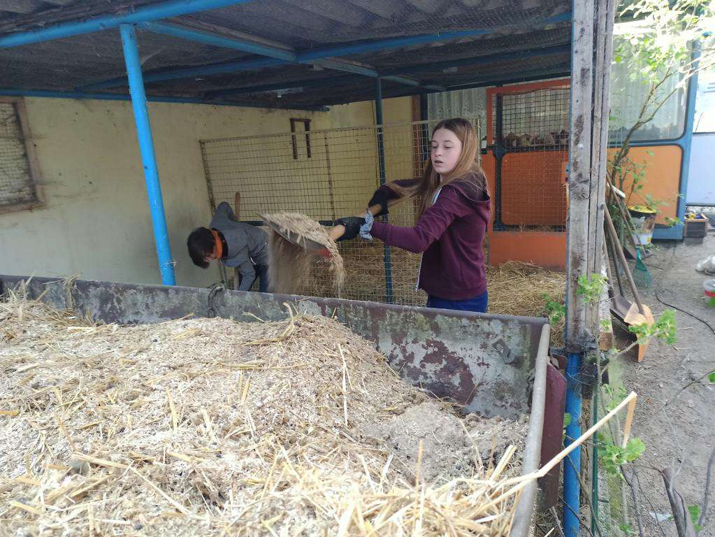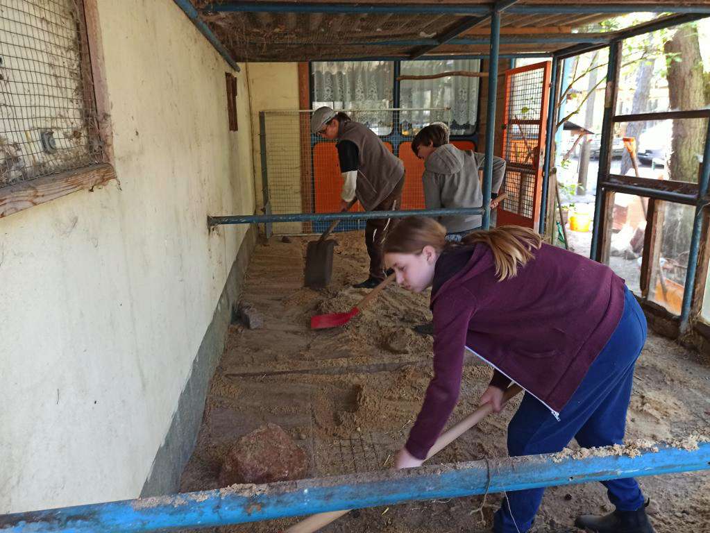 Die beiden packten richtig zu: Das Kaninchengehege wurde komplett ausgeräumt. Die alte Einstreu musste herausgekratzt und zum Kompost gebracht werden. Das sind mehrere Stunden harte Arbeit.