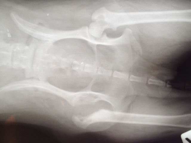 Aber Felipa ließ das eine Hinterbeinchen neuerdings so eigenartig hängen und trat nicht mehr damit auf. Also ließen wir es abklären. Es stellte sich heraus, dass sich der Knorpel des Oberschenkelhalskopfes zersetzt.