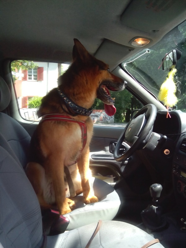 Seine größte Leidenschaft, gleich nach dem Baden, ist jedoch das Autofahren. Sowie eine Autotür oder der Kofferraum aufgeht, hockt er bereits drin und wartet darauf, dass es losgeht. Er ist nicht besonders wählerisch; wenn man nicht aufpasst, kann es auch schon mal ein fremdes Auto sein.