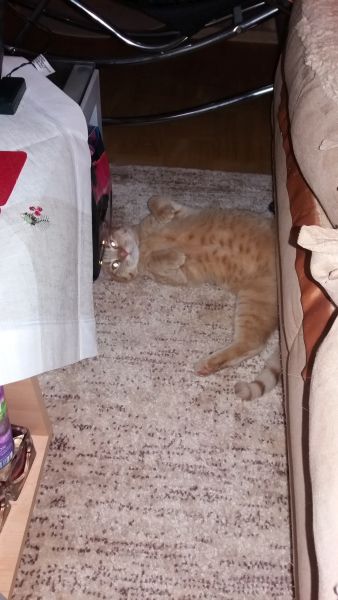 "Tabbi geht es sehr gut. Er fühlt sich wohl. Püppi ignoriert ihn und guckt ihn ab und an etwas böse an. Kasper und Tabbi beschnuppern sich. Tabbi geht immer auf Kasper zu. Kasper weis noch nicht so richtig. Also abwarten und Zeit lassen. Er frisst gut und geht auf die Katzentoiletten. Er ist so klug und flink. Ich hoffe alles wird gut." (Bild 1 und 2)