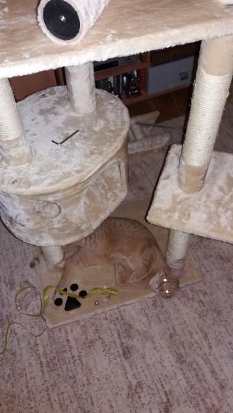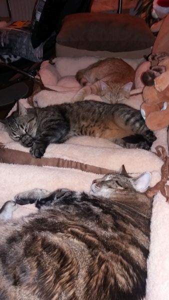 "Hallo hier mal wieder eine kurze Meldung. Kasper und Tabbi verstehen sich sehr gut. Die toben und spielen miteinander. Püppi hat auch keine Probleme mit ihm. Die drei fressen zusammen und der Kleine darf auch alle Liegeplätze von Kasper und Püppi benutzen. Kasper akzeptiert ihn. Nach 2 Wochen kann ich sagen Kasper und Tabbi - es scheint zu passen. Den neuen Kratzbaum finden beide toll. Alles ist so als ob Tabbi schon immer hier war. Ich freue mich, dass es so ist wie es ist. Ich kann nur sagen, dass Tabbi zu uns gehört. Er geht hier nicht mehr weg." (Bild 6, 7 und 8)