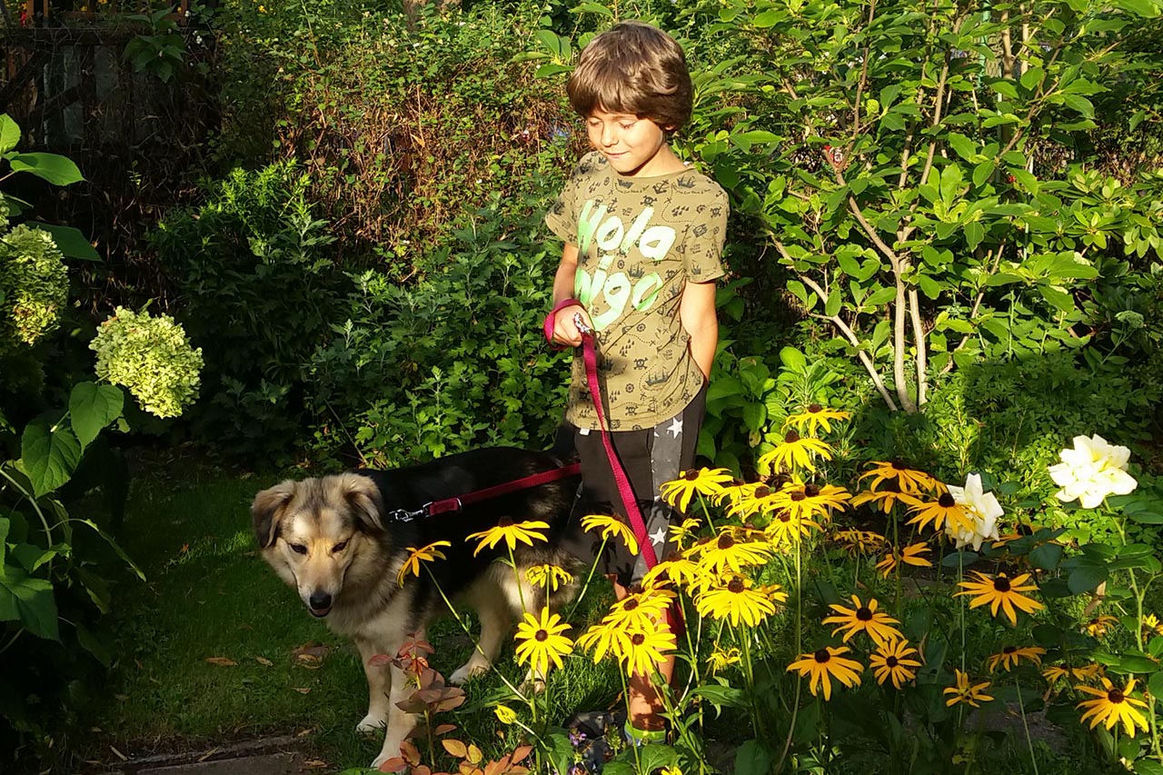 Erstmal haben wir sie im Garten an ganz langer Leine. Um sie daran zu gewöhnen. An die Umgebung. Anbei ein paar Fotos.