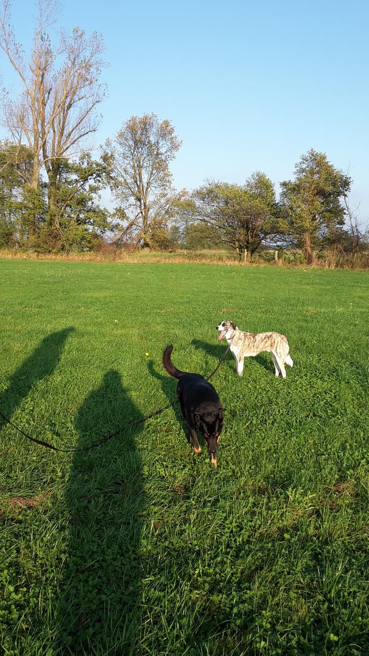 In den letzten zwei Wochen ist viel passiert, es gibt inzwischen kleine Momente, wo er sich wie ein ganz normaler Hund gibt. Bis er wirklich zumindest in seiner gewohnten Umgebung komplett angstfrei ist, wird es aber noch eine Weile dauern. Am mutigsten ist er abends und nachts, wenn es dunkel ist und drinnen und draußen langsam Ruhe einkehrt. Tagsüber geht er wirklich nur mal ganz schnell zum pullern auf den Hof, abends wird aber dann ausgiebig geschnuppert und inspiziert und ab und an auch schonmal mit Polly getobt.