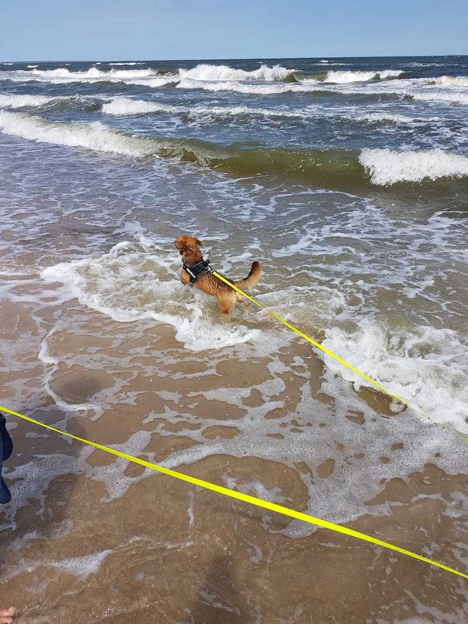 Die Wellen können nicht groß genug sein. Er bellt die an und beißt rein. Dabei vergisst er alles um sich rum.