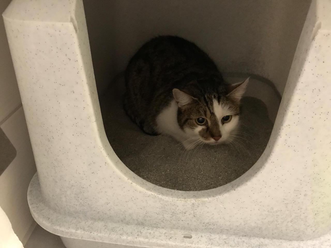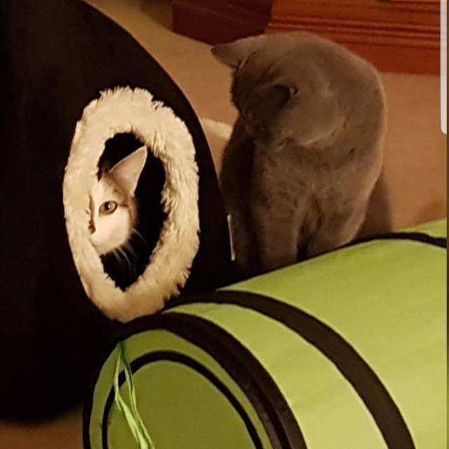 Bei der Ankunft bei uns, ist die Kleine gleich ins Katzenklo geflüchtet. Das hat sie dann auch, zu unserer Freude, sehr gut angenommen. Sie teilt sich das ganz toll mit Winni. Die erste Begegnung der beiden ist auch auf einem der Bilder zu sehen. Jetzt passen die beiden zusammen, wie Latsch und Bommel. :-)