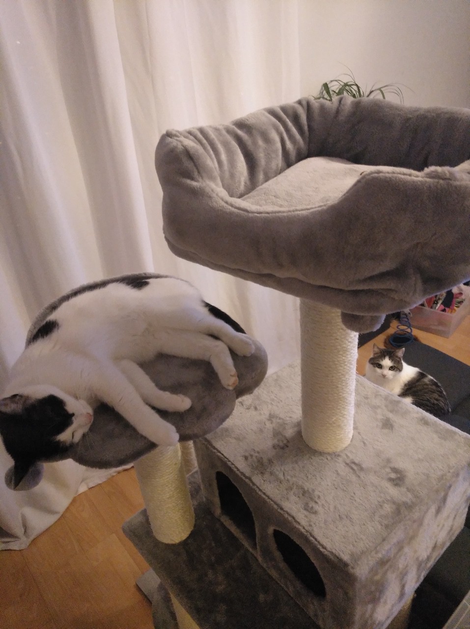 Beide gehen Besuchern aus dem Weg, die täglichen Dosenöffner sind jedoch gerne gesehen und werden regelmäßig gekuschelt. Manchmal spielen die zwei miteinander, oder gucken zusammen aus dem Fenster, meistens halten sie sich aber in verschiedenen Ecken auf. Einig sind sie sich auch in der Essenswahl, Rind bleibt liegen, Hühnchen wird schnellstmöglich verspeist.