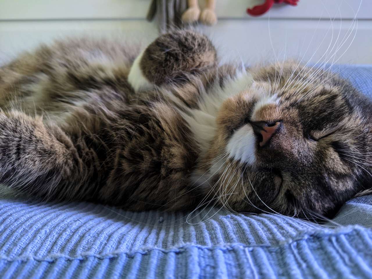 Silvester ist ein bisschen schreckhaft und genießt die ruhigen Momente. Fasziniert schaut er aus unserem gesicherten Küchenfenster ins Grüne oder betrachtet die Welt in der geöffneten Balkontür. Nachdem er auch die Höhe liebt, haben wir ihm eine Wandliege montiert, auf der er die eine und andere Stunde verdöst. Wild wird es beim Spielen. Am liebsten jagt er Angeln und Schnüren nach, spielt aber auch fast Profifußball mit Bällen.