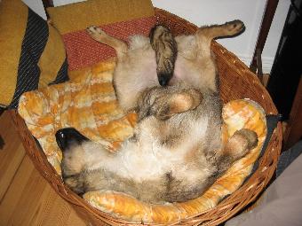 Ansonsten fühle ich mich wirklich wohl hier und schlafe inzwischen völlig entspannt. Zugegeben, das Körbchen habe ich meiner großen Schwester gemopst, aber es ist soooooo gemütlich.