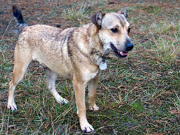 In meinem neuen "Wald" gehen wir oft spazieren. Ich habe schon eine herrliche Hasenfährte aufgespürt und eines Abends war es dann so weit: ich sah einen Hasen und wollte hin. Da war nur diese lästige Leine, die mich daran hinderte, ihn zu erwischen. Ich schwöre es euch!
