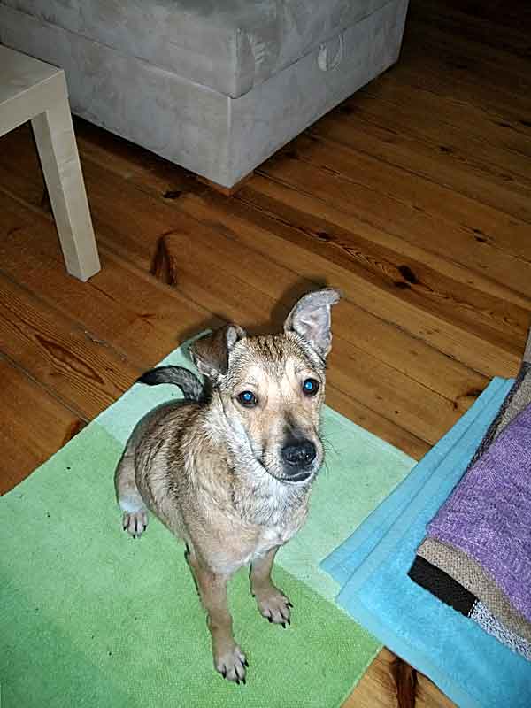 bin gut in Berlin angekommen  (na gut, ein ganz bisschen habe ich im Auto geweint, aber höchstens 5 Minuten). In meinem neuen Zuhause wurde ich schon sehnsüchtig erwartet. Ich habe mich dann auch von meiner besten Seite gezeigt: gar nicht gebellt, nur mit dem Schwanz gewedelt und meinen absolut bestechenden Blick aufgesetzt. Hat geklappt: alle sind verliebt!