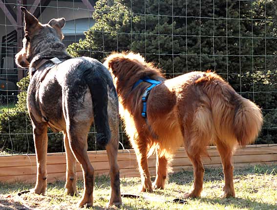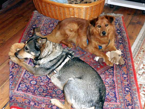 Martha und Goldi sind jetzt auch in der Hundeschule. Martha kennt bereits viele Kommandos und befolgt sie auch meistens. Für Leckerchen tut sie so ziemlich alles. Sie tobt gerne im Garten, liebt Suchspiele und das Apportieren. Goldi muss noch ein bisschen mehr lernen. Auch ausgelassenes Spielen scheint er nicht zu kennen. Er ist aber sehr lernwillig und fasst durch das Training immer mehr Vertrauen zu sich und zu uns. Bestimmt wird aus ihm auch noch mal ein selbstbewusster Rüde.