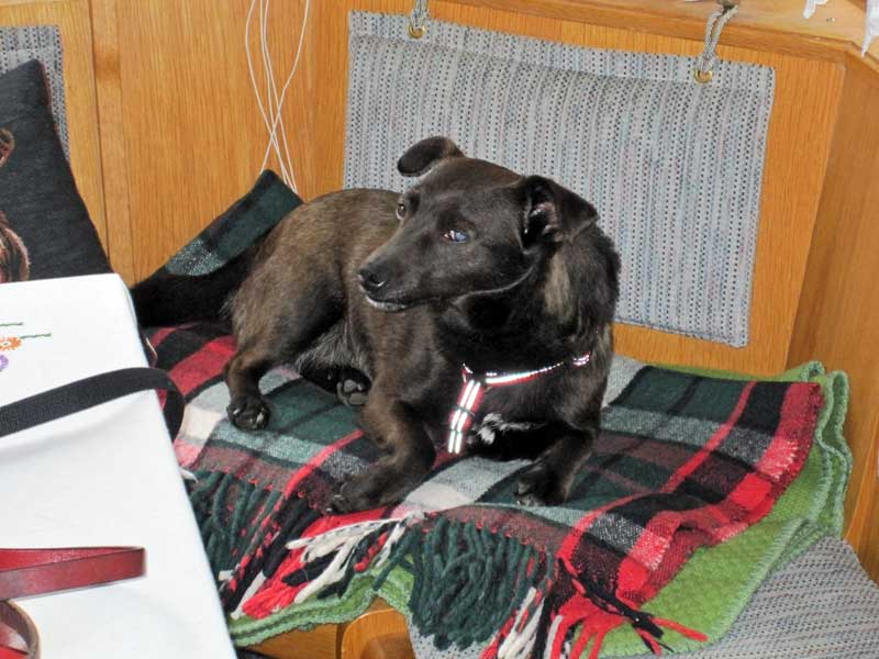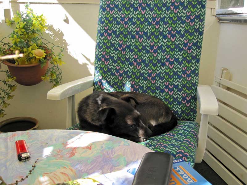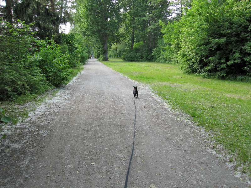 Ein Geschirr habe ich auch bekommen, damit fühle ich mich wohler, wenn wir unterwegs sind. Inzwischen habe ich Frauchen auch den Gefallen getan, „Sitz“ und „Down“ zu lernen und gehe auch öfters schon mal ganz ordentlich an der Leine, wenn ich nicht allzu beschäftigt bin, um auf „Fuß“ zu hören. Frauchen meint, wir müssen daran noch arbeiten. Sie hat das aus so schlauen Büchern, wo drin steht, was man als guter Hund so alles können und machen soll. Naja, wenn sie meint. Aber sonst lobt sie mich immer sehr. Und apropos Autofahren, ich steige jetzt immer ganz cool ins Auto und mache es mir auf dem Rücksitz bequem und fahre überall mit hin. Meinen eigenen kleinen Sicherheitsgurt habe ich natürlich auch. Meistens geht es ja auch dahin, wo es schön ist. Zum Beispiel in unseren Garten. Die Hollywoodschaukel ist ja nun meine, da kann ich stundenlang sitzen, habe alles im Blick, was vorüberkommt und was so los ist. Wir gehen an der Havel spazieren, die ist quasi vor der Tür. Da laufe ich dann an einer ganz langen Leine und das erste Mal habe ich einen richtigen Tobeanfall gekriegt, weil ich mal wieder so richtig rennen konnte. Frauchen rennt hier in der Stadt auch manchmal mit mir an der Leine, aber sie ist ja längst nicht so schnell wie ich. Vielleicht gehe ich im Sommer ja auch mal baden. Mal sehen.