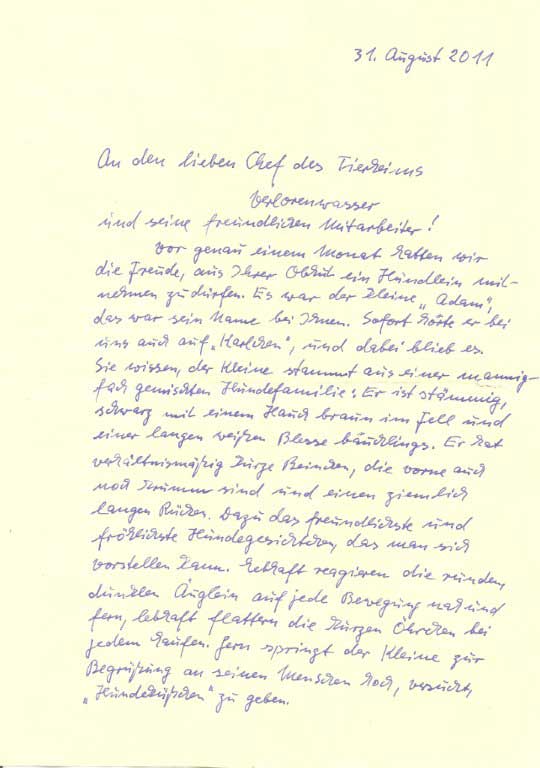 Vor genau einem Monat hatten wir die Freude, aus Ihrer Obhut ein Hündlein mitnehmen zu dürfen. Es war der kleine "Adam", das war sein Name bei Ihnen. Sofort hörte er bei uns auch auf "Karlchen", und dabei blieb es. Sie wissen, der Kleine stammt aus einer mannigfach gemischten Hundefamilie: Er ist stämmig, schwarz mit einem Hauch braun im Fell und einer langen weißen Blesse bäuchlings. Er hat verhältnismäßig kurze Beinchen, die vorne auch noch krumm sind und einen ziemlich langen Rücken. Dazu das freundlichste und fröhlichste Hundegesichtchen, das man sich vorstellen kann.