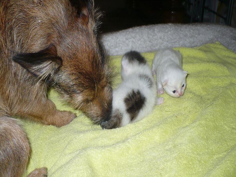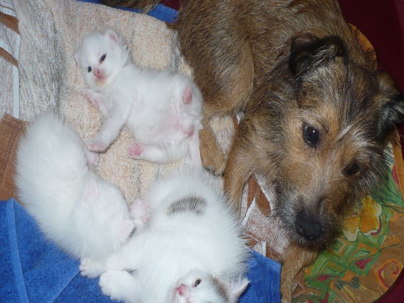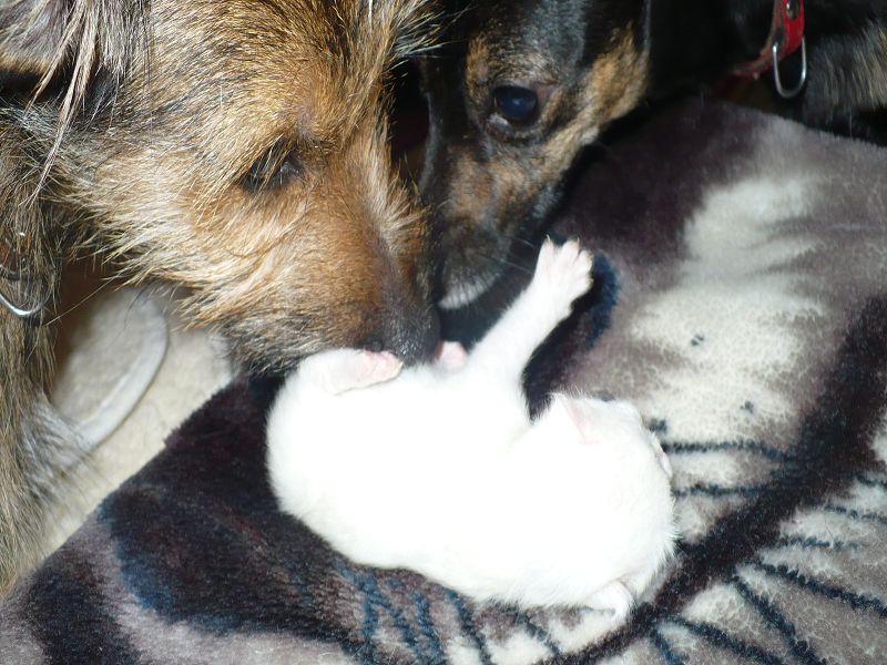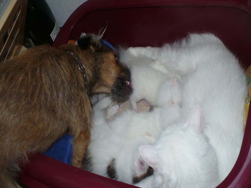 Ich sage Euch, das letzte Jahr war hier vielleicht aufregend und anstrengend. Das muss ich Euch erzählen. Wir haben hier doch 4 Katzenbabys von 2 Mamas bekommen. Das war ein Ding. Aber unsere eine Mami, die Miss Elly, konnte sich die ersten Tage nicht um ihre 2 Babys kümmern. Sie hat sehr hohes Fieber bekommen und konnte ihre Babys weder säugen noch pflegen. Und nun komme ich ins Spiel. Mein von mir heißgeliebtes Frauchen und unsere Tierärztin haben voller Stolz gesagt, wenn ich nicht gewesen wäre, wären diese Babys nicht mehr am Leben. Mein Frauchen und Alexandra haben beiden rund um die Uhr das Fläschchen gegeben, und ich habe den Putz und Pflegedienst übernommen. Ich durfte sogar mit in der Wurfkiste liegen, soviel Vertrauen hatte Miss Elly. Dies war alles furchtbar aufregend und anstrengend, aber diese ganze Mühe hat sich gelohnt. Aus 182 gr Katzenbaby ist nun eine 2,8 kg schwere Katze geworden, und das schmusen und gegenseitige putzen ist geblieben. Aber dann kam das aller schlimmste, und das hieß Abschied nehmen. Leute, das sind doch "meine" Babys und die sind nun bei neuen Familien. Das gute an der Sache ist aber, das diese Familien uns schreiben und mir Bilder schicken, damit ich immer weiß, wie es meinen Babys geht.